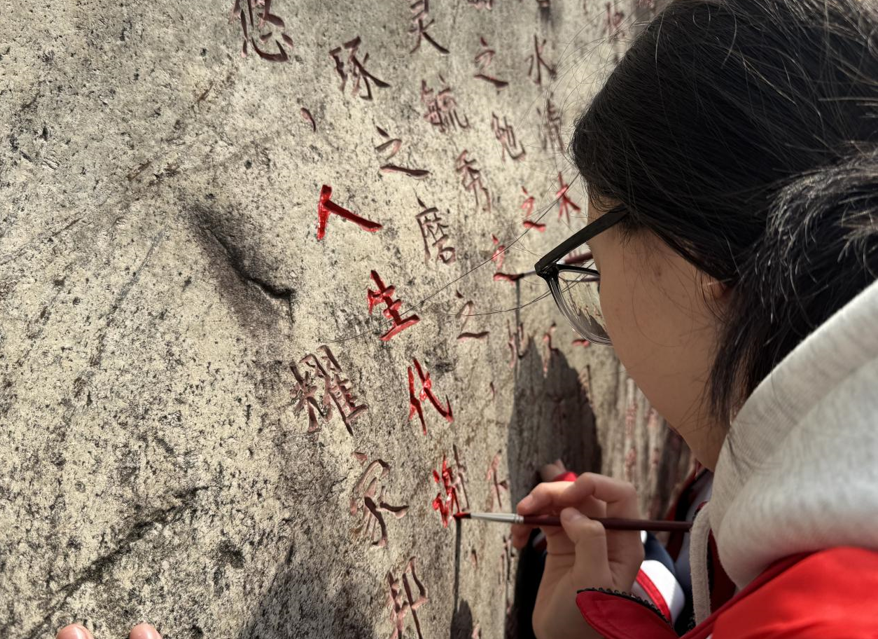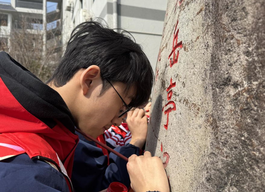 高二志愿队则聚焦校园内非文物景观石,开展清洁与描红志愿服务。活动前期,团委提前排查景观石分布、明确描红范围,避免触碰文物类景观,并备好软毛刷、抹布、红色油漆、防护手套等工具,做好油漆使用的安全提醒。活动中,同学们分工协作、默契配合:一组同学用软毛刷和抹布仔细清理景观石表面的灰尘、污渍,让石面恢复洁净;一组专人负责描红工作,循着原有字体轮廓,手持油漆刷均匀涂抹红色油漆,力求字迹清晰、规范美观,做到不溢色、不涂改;描红完成后,大家及时清理现场的油漆痕迹,将工具整理归置,全程细致认真、一丝不苟。操作中,同学们均佩戴防护手套,规范存放和使用油漆,悉心爱护景观石,用实际行动践行文明志愿的理念。