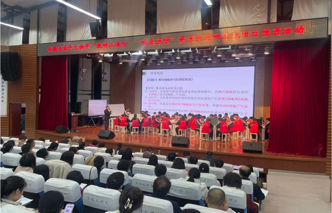 活动还设置了专题报告环节,推动教学实践向理论深处漫溯。安庆一中朱晨兵老师作《高中生物学三年六段一体化进阶教学实践》报告,系统阐释了以“高一夯实基础、高二深化理解、高三能力突破”为核心的三年一体化教学模式,并分享了分层作业、实验教学等具体策略,为一线教学提供了可借鉴的实践范式。