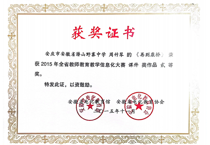 近日,2015年安徽省教师教育教学信息化大赛评选结果正式揭晓,野寨中学教师凭借扎实的教学功底与创新的信息化应用能力脱颖而出,陈结根、周竹琴两位老师分别荣获一等奖、二等奖,为学校赢得荣誉。