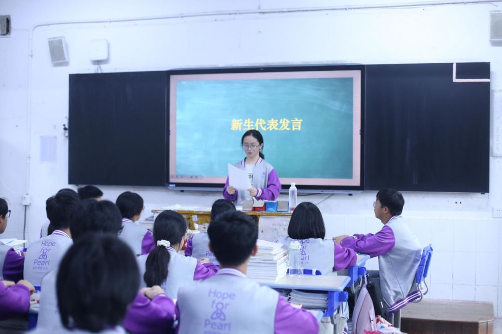 随后,新生代表上台发言。她以真挚的语言表达了对浙江省新华爱心教育基金会、学校以及社会各界爱心人士的感激之情。她说:“我们或许来自偏远的乡村,或许曾因家庭困境而迷茫,但‘珍珠班’为我们点亮了前行的灯塔。我们将珍惜这来之不易的机会,以勤奋为笔,以汗水为墨,书写属于自己的精彩人生。”铿锵有力的誓言,赢得了现场阵阵掌声。