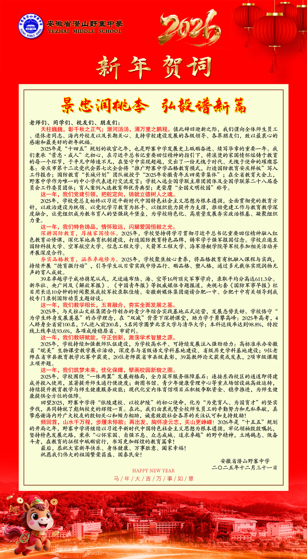 野寨中学2026年新年贺词