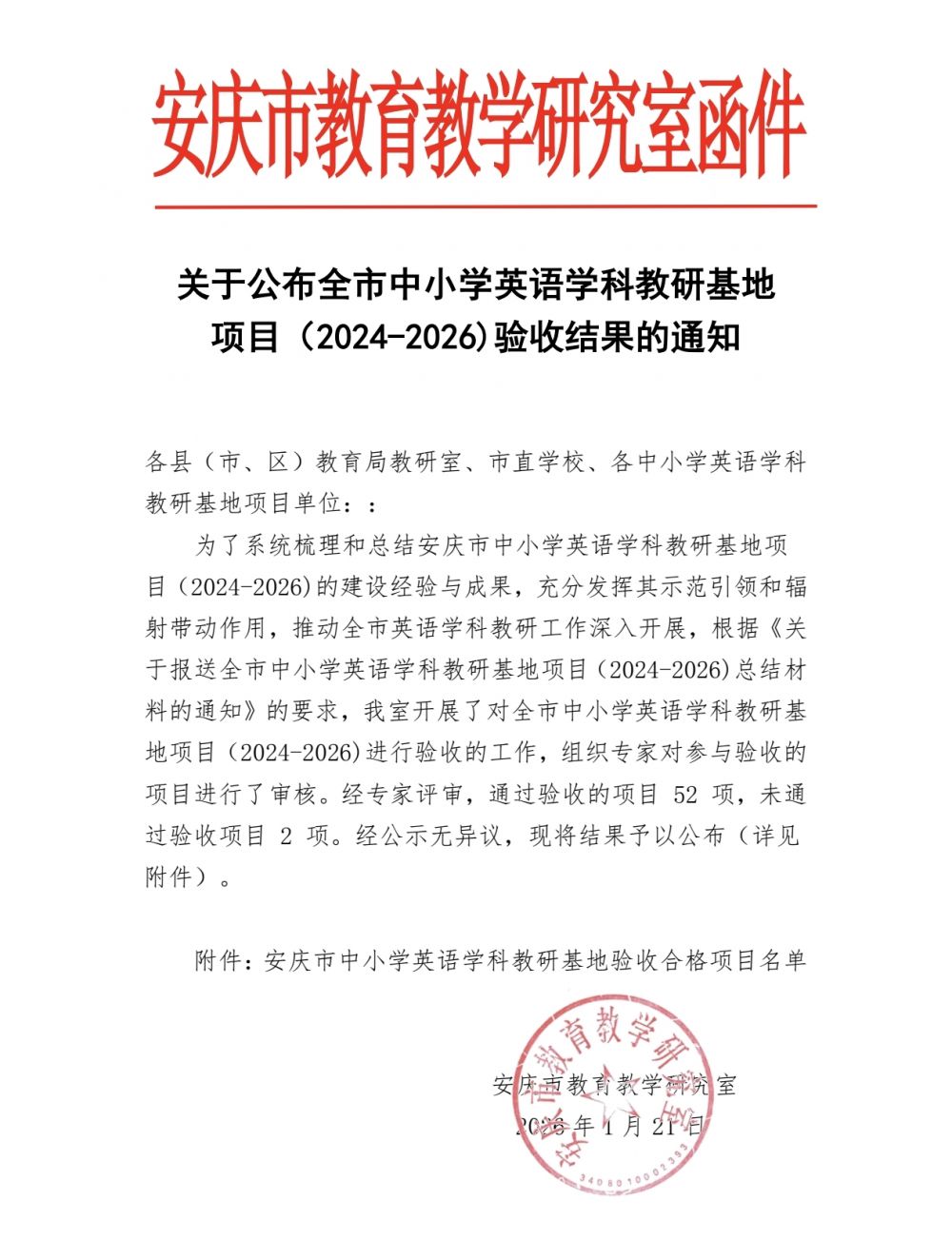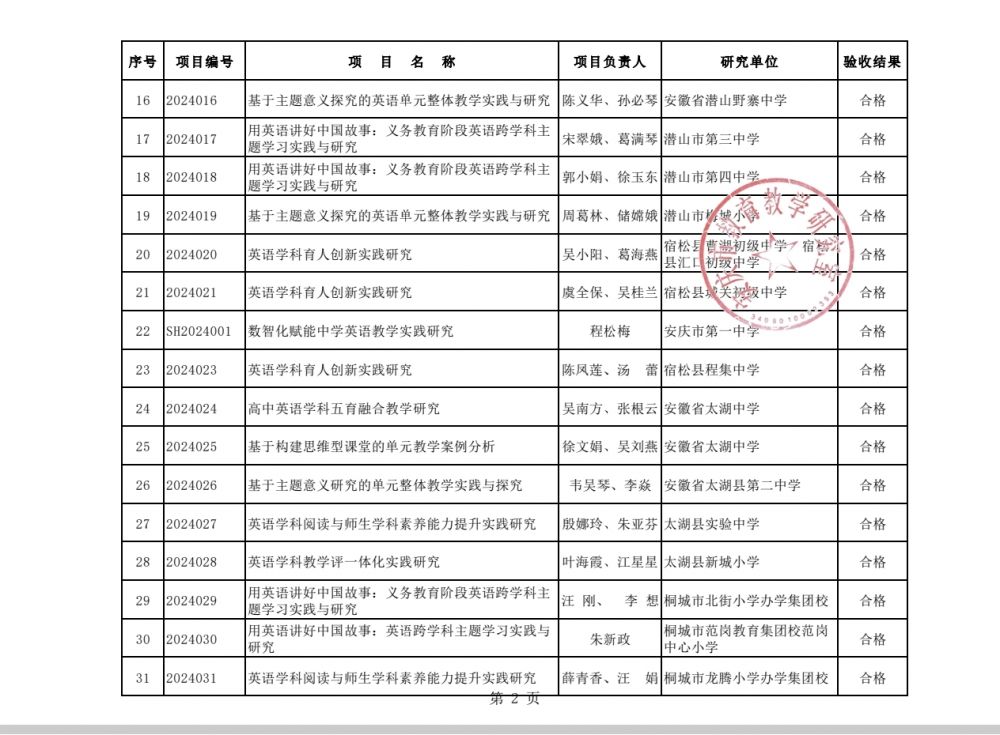 近日,我校主持的安庆市中小学英语教研基地项目《基于主题意义探究的英语单元整体教学实践与研究》(证书编号:2026-24016),顺利通过安庆市教育教学研究室组织的专家验收。这一成果不仅是对我校英语教研工作的高度认可,更为学校英语学科高质量发展注入了强劲动力。