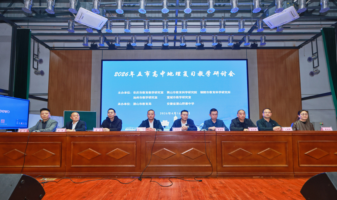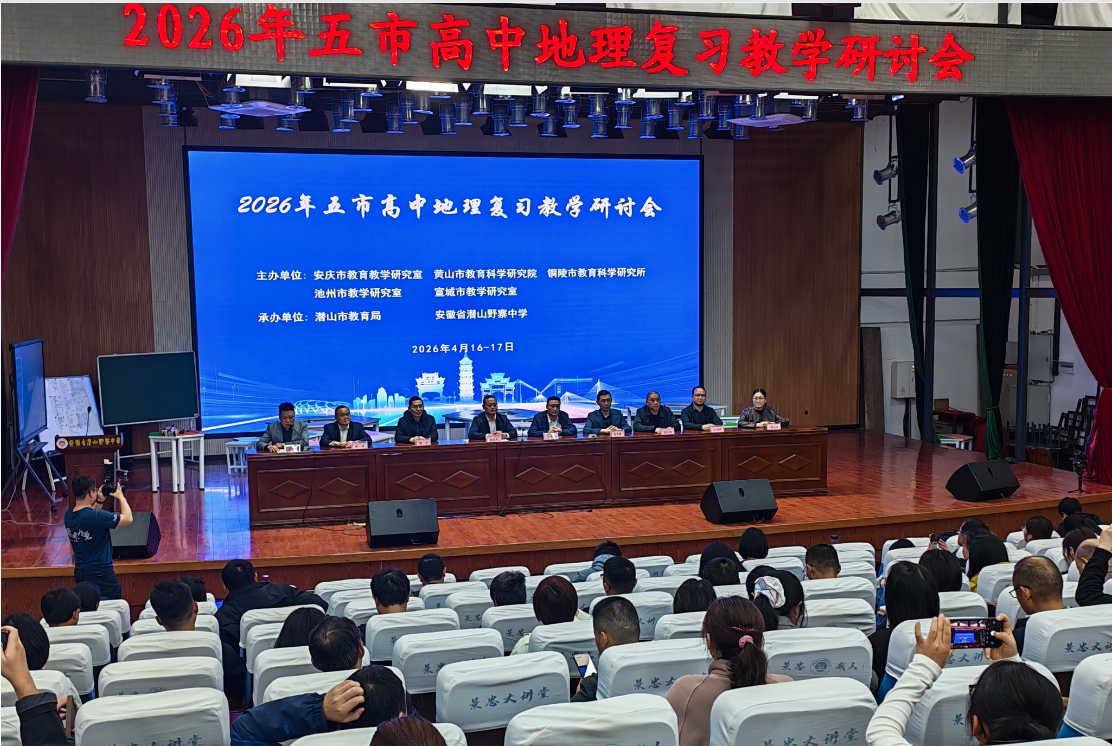 为落实省教科院区域联片教研、跨区域协作教研工作要求,精准应对2026年高考地理备考新形势,整合安庆、黄山、铜陵、池州、宣城五市地理教育优质资源,交流复习教学经验,科学把握备考方向,4月16至17日,2026年五市高中地理复习教学研讨会在潜山市成功举办。本次活动由安庆市教育教学研究室牵头,联合黄山、铜陵、池州、宣城市教研室共同举办,潜山市教育局、潜山市野寨中学共同承办。五市地理教研员、高中地理学科委员会成员及各普通高中高三地理骨干教师齐聚一堂,共探高中地理复习教学提质增效之路。