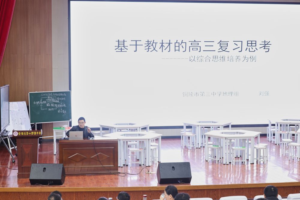 17日上午的专题讲座环节,五市五位地理教学骨干围绕高三复习备考关键议题展开深度分享。安徽省宣城中学朱良辉老师从野外实践角度,探讨高考地理 "情境认知" 能力的培养路径;铜陵市第三中学刘强老师结合新教材编写理念,分享高三地理复习教学的实践思考;池州市东至二中束建波老师聚焦区域认知素养,讲解二轮复习的精准突破方法;休宁中学张传田老师针对双休减负、严控教辅的背景,提出高中地理二轮复习的优化策略;望江县第二中学叶海燕老师紧扣新课标与核心素养要求,阐述地理二轮专题整合与提升的思路。五位老师的讲座各有侧重、干货满满,既有前沿的理念引领,又有具体的实践方法,为五市高三地理复习备考搭建了系统的理论框架,让参会教师深受启发、满载而归。