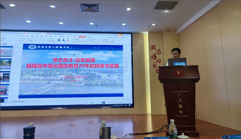 本次平行活动聚焦新时代国防科技教育面临的机遇与挑战,设置专题报告与实践分享环节。国防大学战役部教授孙旭首先作题为《国防安全战略思考》的专题报告。随后,青岛二中、广州大学附属中学分别介绍了各自在国防科技教育领域的实践经验与成果。在交流发言环节中,朱太平书记以野寨中学的探索实践为例,简要阐述了学校“情感化育人”的核心思路。他介绍,位于大别山革命老区的野寨中学,2023年因20名考取军校的学生致信习近平总书记获亲笔回信勉励。学校以此为契机,构建了以情感共鸣激发家国担当的国防教育体系。
