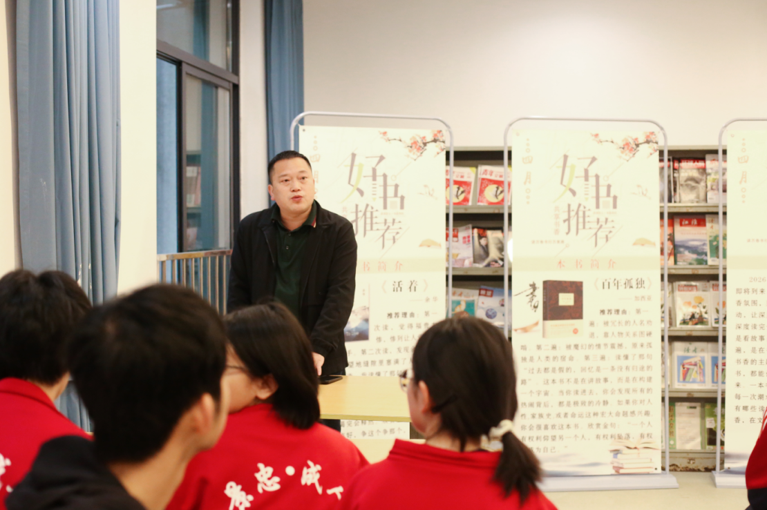 活动现场,图书馆为在场师生带来了专题新书推荐分享。涂老师结合数十年的阅读推广与图书管理经验,向师生们分享了深度阅读的核心方法:“深度读完一本书,要读三遍:读第一遍,是看故事;读第二遍,是品人生;读第三遍,是在书中看见自己。” 他生动比喻道,一本书读三遍,就像在沙滩上捡贝壳,每一次潮水退去,都能发现新的纹理。借着本次共享书香的主题,他为师生们精选推荐了一批值得反复品读、能让人在喧嚣世界里沉心静气的优质书目。